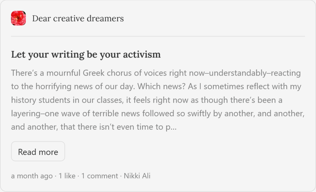 I recommend her whole Substack post for all readers and writers trying to reconcile the world and their writing/reading practice. To read it, click on the image below.